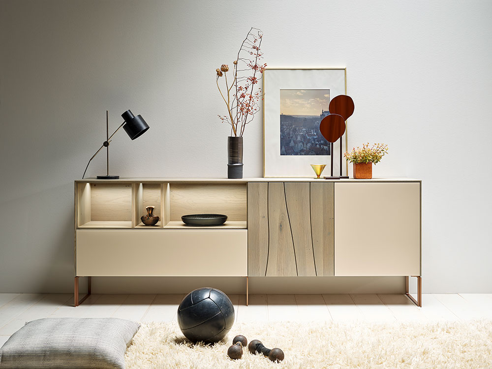 Dieses Sideboard setzt sich in Asteiche platin geölt mit Glas in rosé matt kunstvoll in Szene. Die schlanke Linienführung und die Fußgestelle in Metall bronce geben diesem Möbelstück eine wunderbare Leichtigkeit. Besonders schön lassen sich Objekte durch die verdeckte LED-Beleuchtung präsentieren.