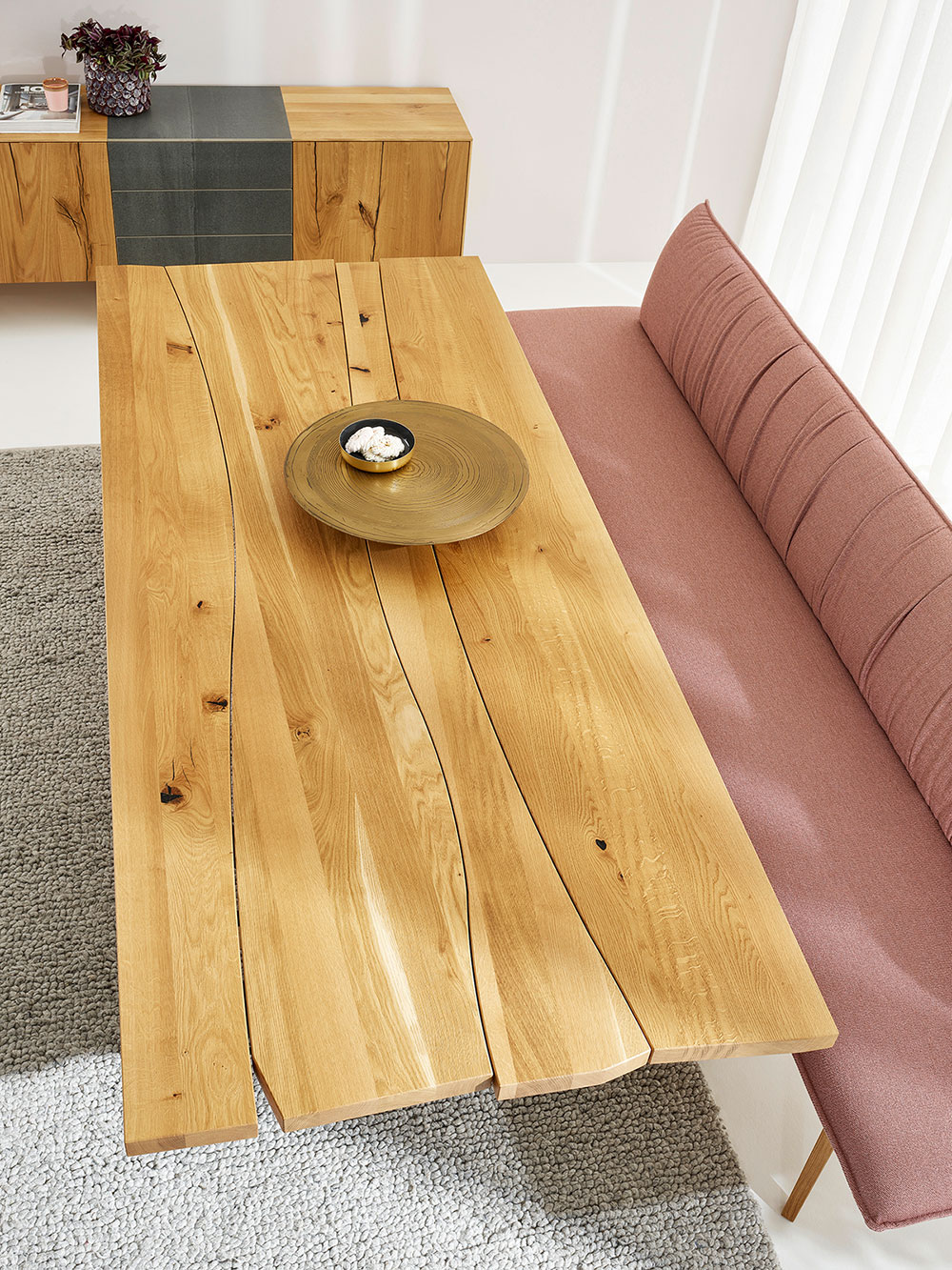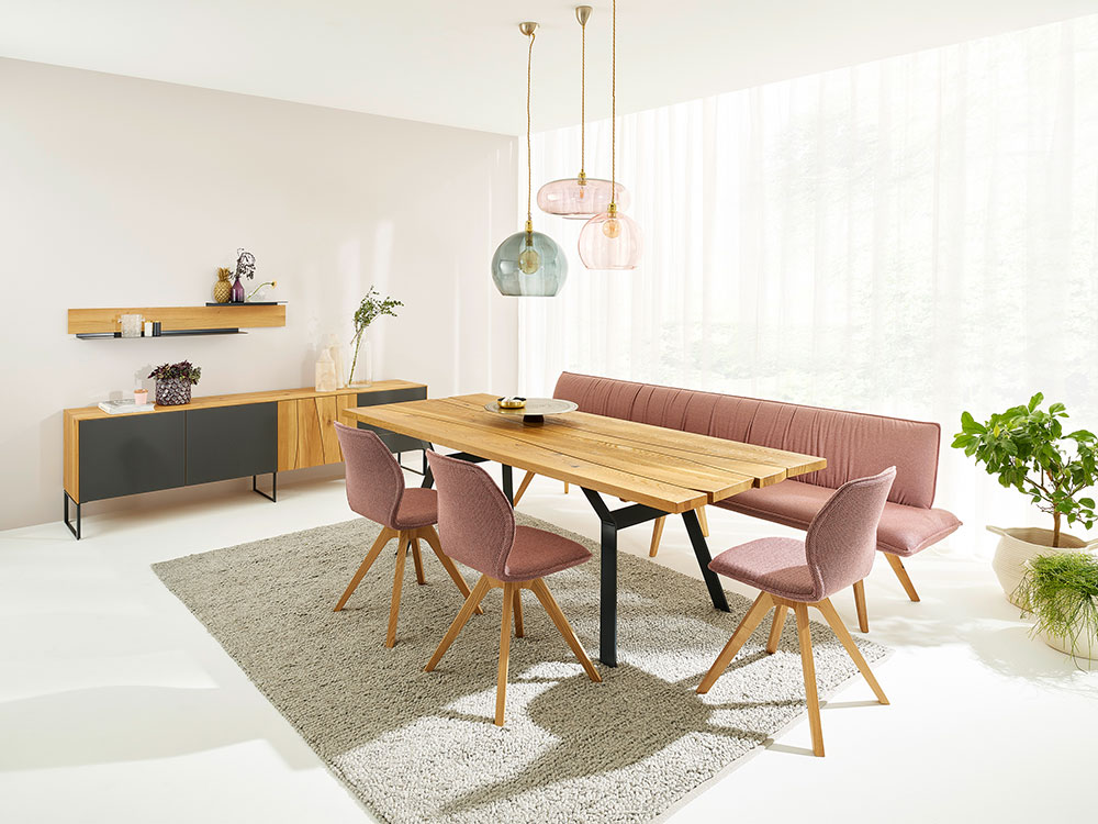 Dieses Speisezimmer ist eine reizvolle Kombination aus massivem Holz, schwarzem Metall und trendigen Polsterungen in rosé. Der Tisch mit seiner Naturdesignplatte in Asteiche ist ein Paradebeispiel für natürliches und organisches Design. Seine große Tischplatte bietet ausreichend Platz für viele Gäste und setzt ein echtes Statement in Ihrem Essbereich. Die sanften Falten der plissierten Rückenpolsterung machen die Bank und die Stühle besonders bequem und bringen den weichen Stoff besonders zur Geltung.