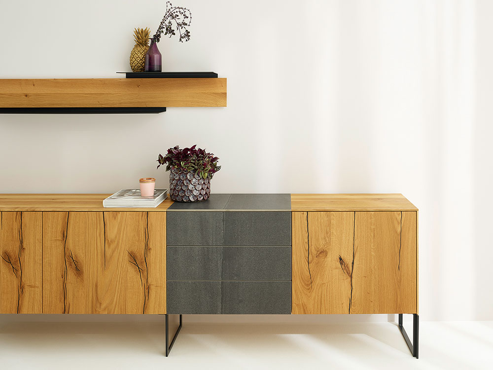 Das neue Exclusivmodell von Anrei berührt im wahrsten Sinne des Wortes. Es ist nicht nur wunderschön anzusehen, sondern biete auch haptische Reize. Massivholz im Naturdesign wird kombiniert mit völlig neuen Fronten in Keramik. Durch die Vielfalt der natürlichen Oberflächen und Strukturen finden sich immer wieder neue Kombinationsmöglichkeiten.