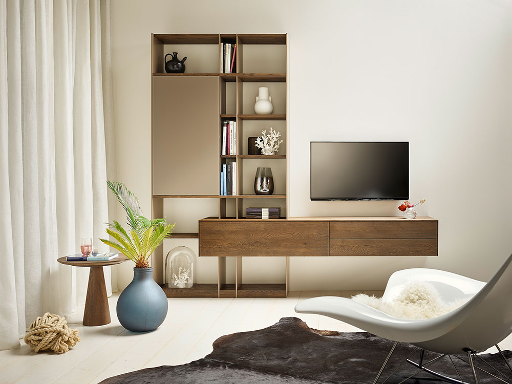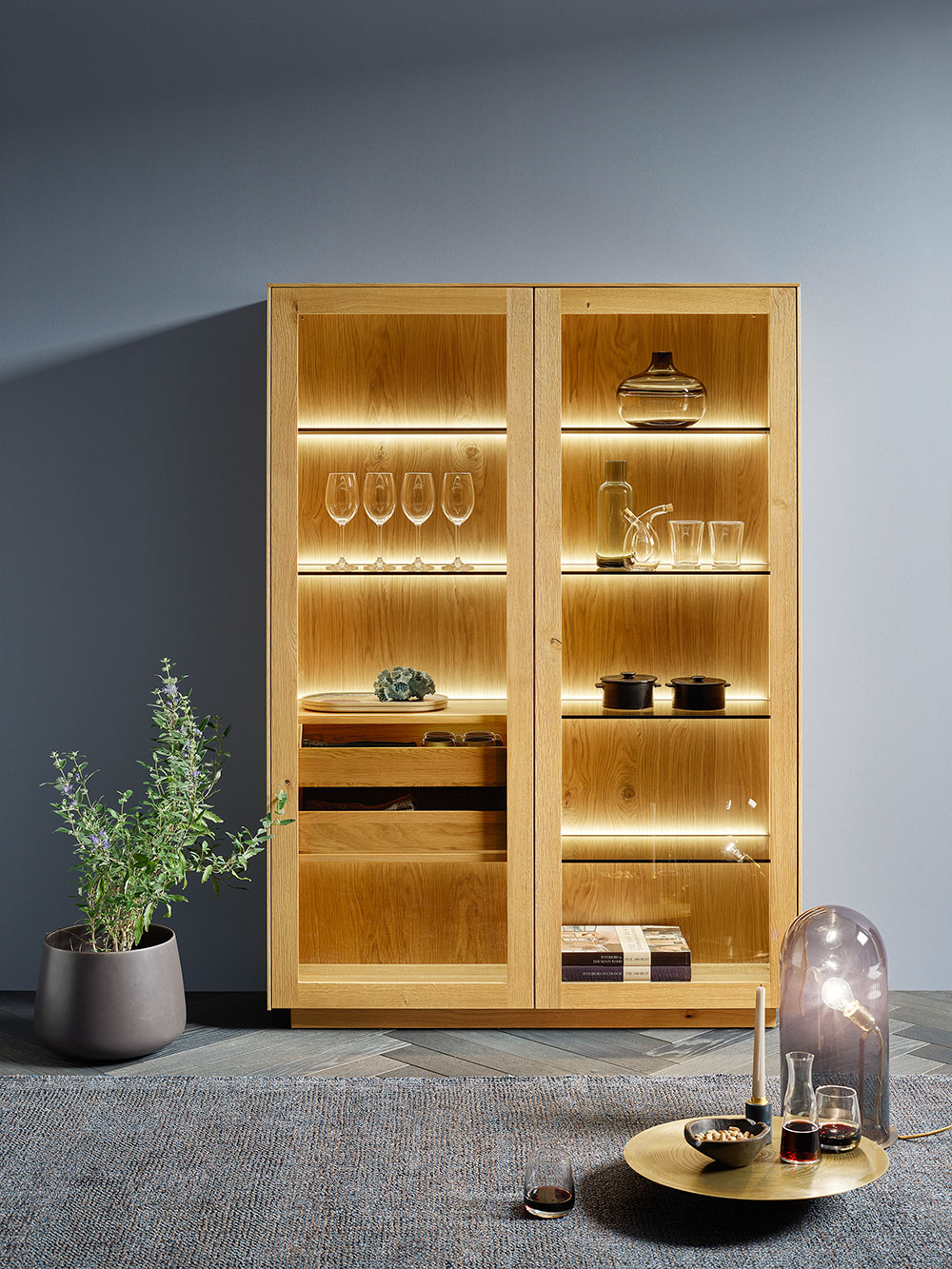 In den neuen cello Vitrinen finden schöne Dinge und Schauobjekte eine effektvolle Bühne. Die Böden mit LED-Glaskantenbeleuchtung setzen Gläser, Vasen und Schalen strahlend in Szene. Mittels Fernbedienung lässt sich das Licht auf Knopfdruck steuern. Massive Innenladen aus gebürsteter Asteiche bieten zusätzlichen Stauraum.